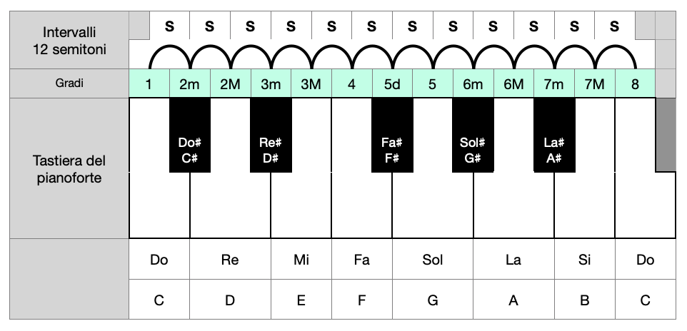 Nella musica occidentale, il contesto nel quale si producono i suoni musicali è diviso in 12 gradi. Ad ogni grado si applicherà una nota precisa. La scala cromatica è la successione di tutti i 12 gradi, perciò tutte le 12 note. Tutte le altre scale musicali contengono meno gradi, possiamo considerare ogni scala come una successione di una selezione di gradi.